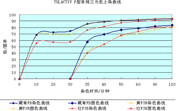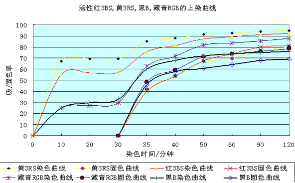 67 | 目前,国内染厂在中温三原色组合中较常使用的是藏青为5号黑(黑KN-B等)或194号蓝(蓝M-2GE,B2GLN等)。众所周知的是5号黑作为双乙烯砜活性基染料,对染色条件极为敏感,加碱前直接性低,上色少;加碱后直接性迅速上升并且快速在纤维上固色,这对染色的匀染性和重现性均有较大的破坏。预加碱或线性加碱工艺对其稍有改善,但仍然较难控制。而194号蓝与红黄相比,直接性又太高,不利于同步上色,移染性差,也不利于匀染。 注: 藏青FB/F2G用于染浅色时,在匀染性和重现性有优势,但其日晒牢度并不是很好,如定单有日晒牢度的要求需要注意。